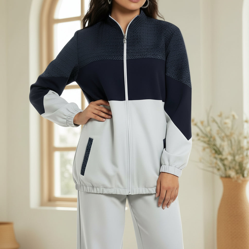 طقم نسائي انيق بقصة مريحة وتصميم عصري يجمع بين الراحة والفخامة. الجزء العلوي يأتي بسحاب كامل مع لمسة نقشه خفيفة على الكتف والصدر تضيف فخامة للمظهر .