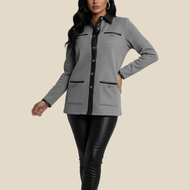 يتميز بتفاصيل جلدية باللون الأسود على الأزرار والحواف والياقة تضيف لمسة عصرية مميزة على الإطلالة