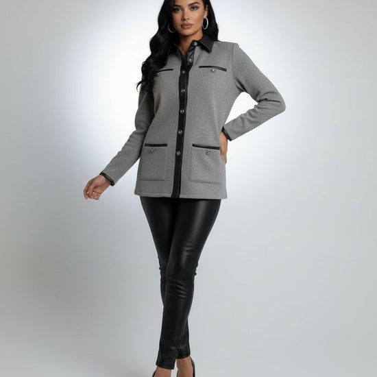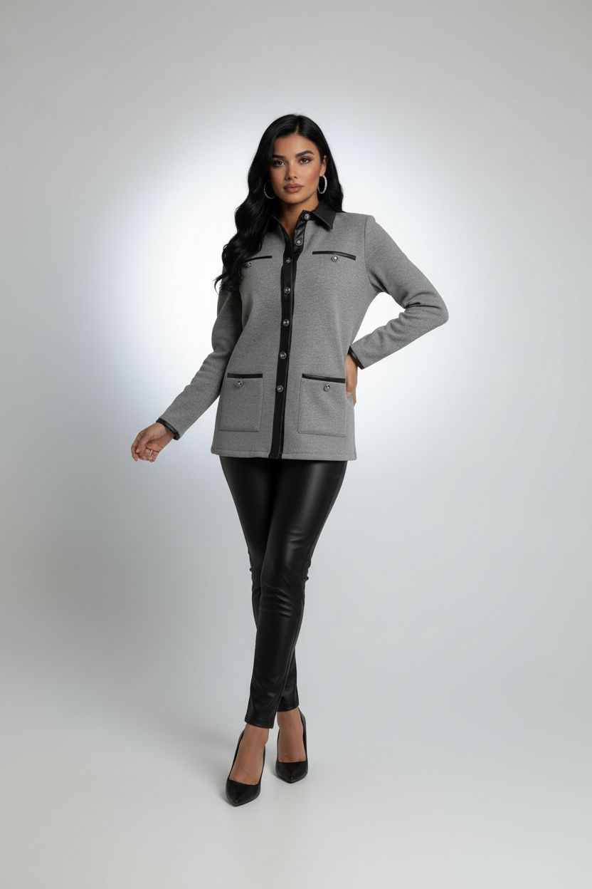 جاكيت أنيق بلون رمادي هادئ بتصميم يجمع بين البساطة والفخامة مصنوع من قماش ناعم متوسط السماكة يمنح راحة وأناقة في الوقت نفسه