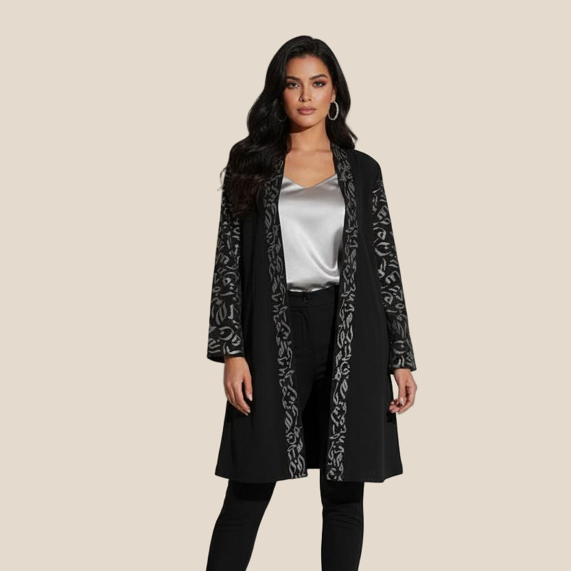 يتميز بتطريز حرفي أنيق على الأكمام والحواف الأمامية ليضفي لمسة فنية فريدة مستوحاة من جمال الخطوط والنقوش العربية كما أن التطريز المتقن يضيف بعداً فاخراً إلى التصميم