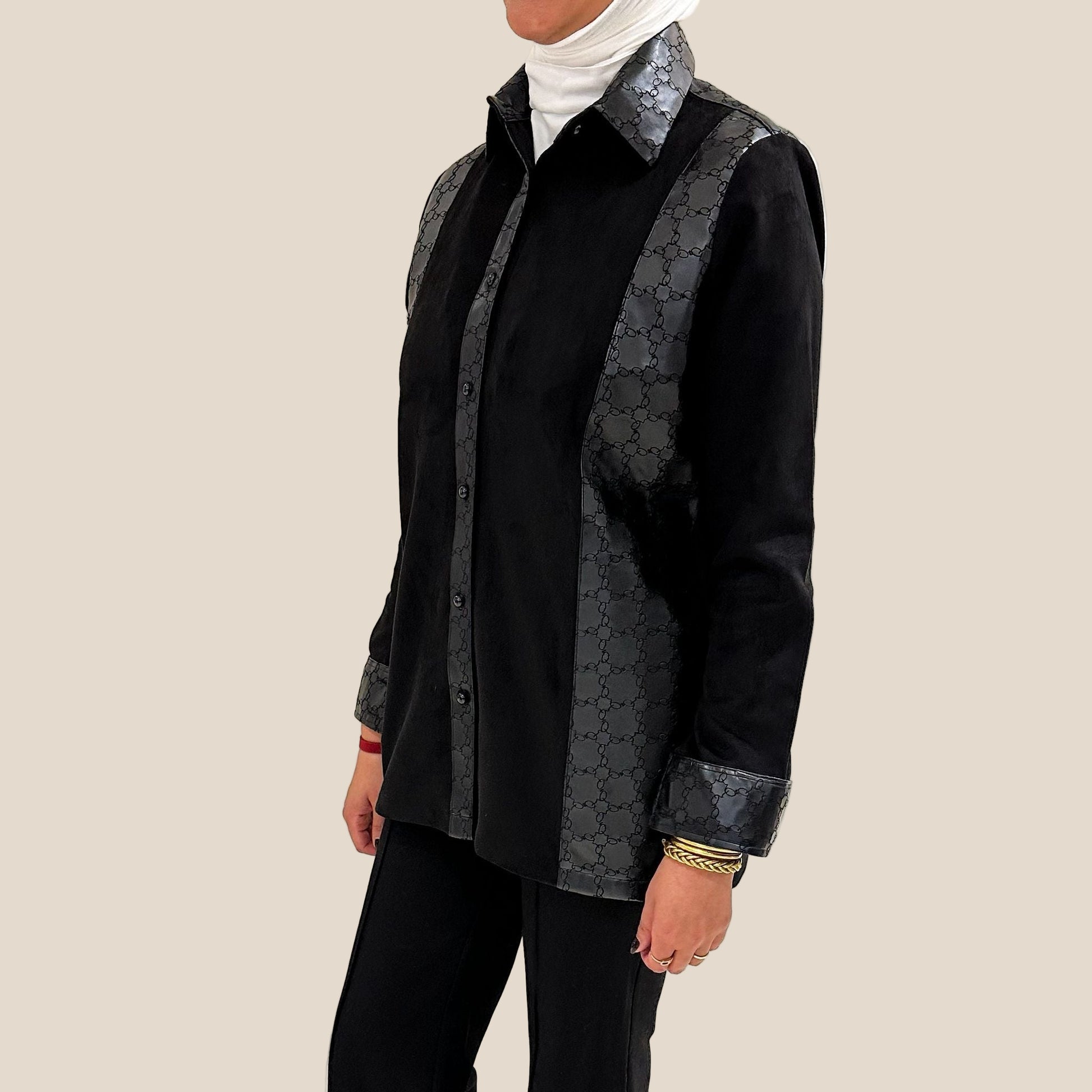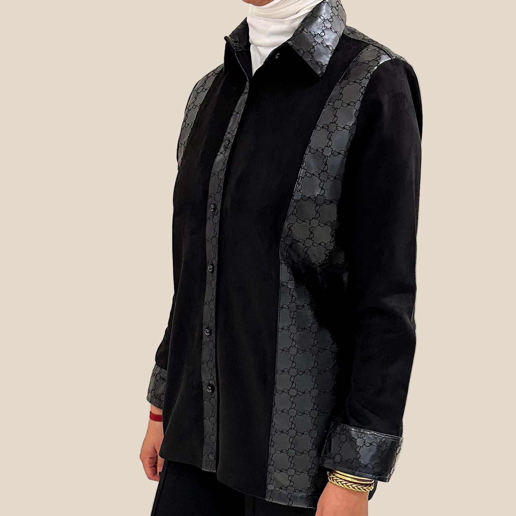 قميص فاخر بتصميم عصري يعكس الأناقة والرقي مصنوع من قماش سويد ناعم بلمسة جلدية منقوشة تمنحه طابعاً فريداً يجمع بين القوة والأنوثة